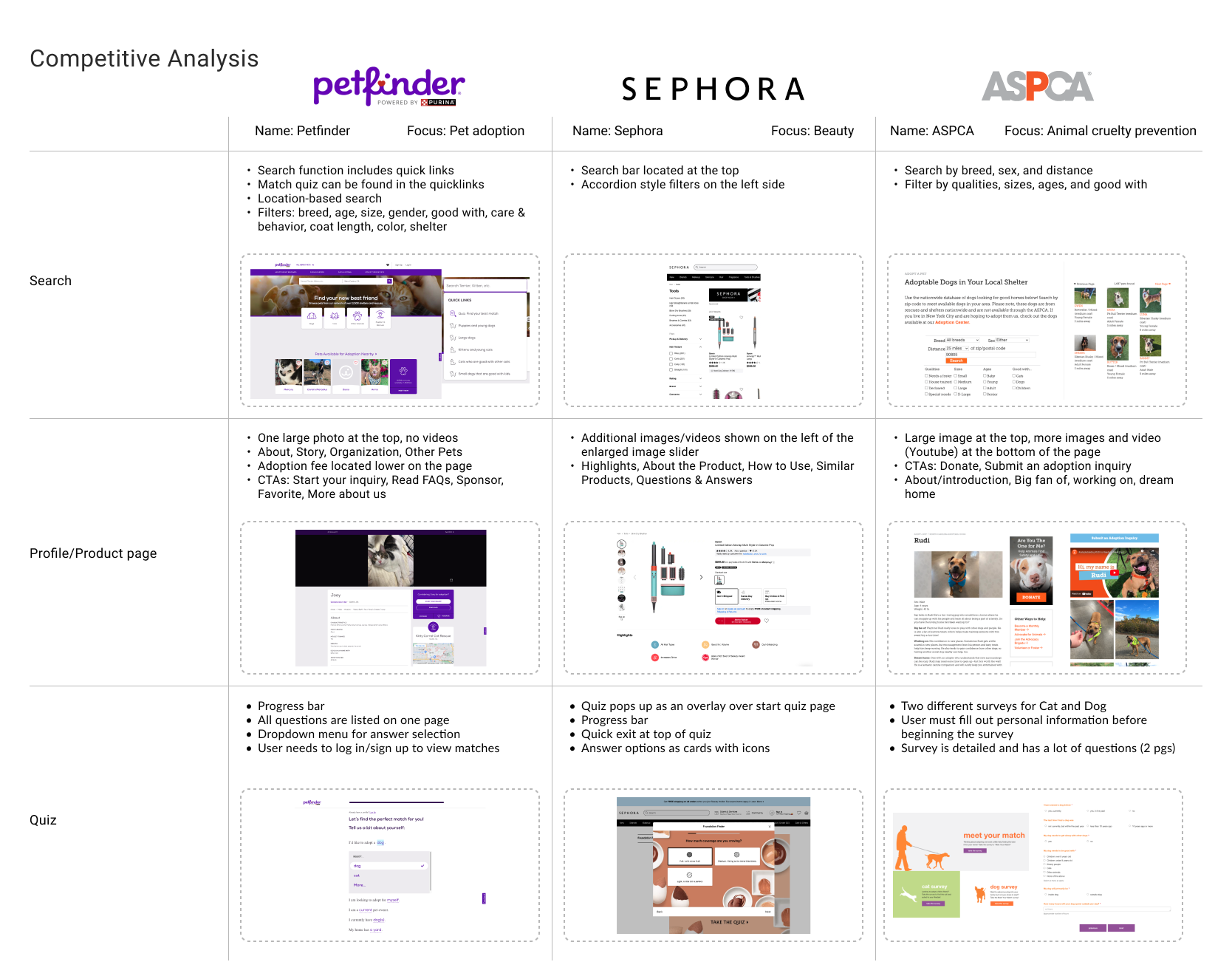 Upon visiting the pet adoption websites, they all greeted me with a large search feature that prioritized filtering by location, breed, and age. Although 2 of the 3 websites had a match quiz feature, it wasn't prioritized and the CTA couldn't be found upfront on the homepage. The quizzes were presented in a list/survey and provided me with a good sense of what questions needed to be asked in order to find a match between the user and adoptable dogs.